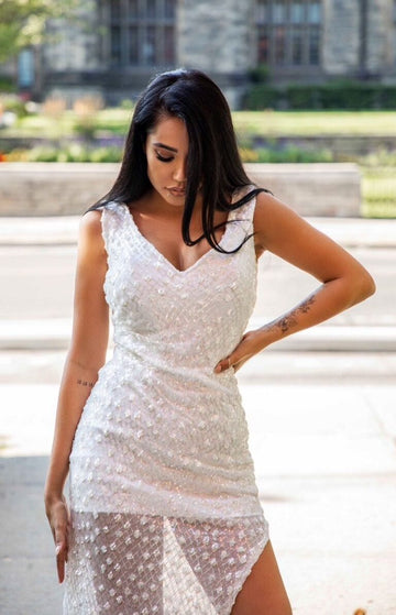 This head-turning dress is made of icy white, sheer guipure with tiny eggshell-coloured sequin clusters....