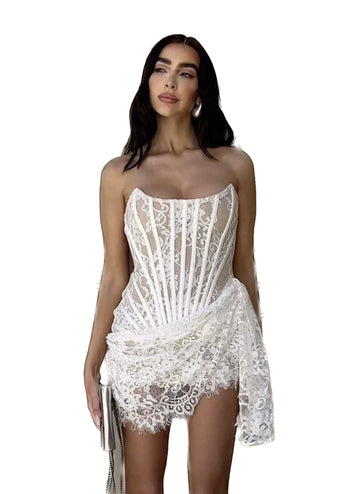 This dress, adorned with exquisite guipure lace, features a flattering corset on the upper body...