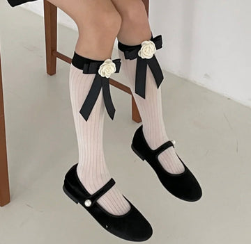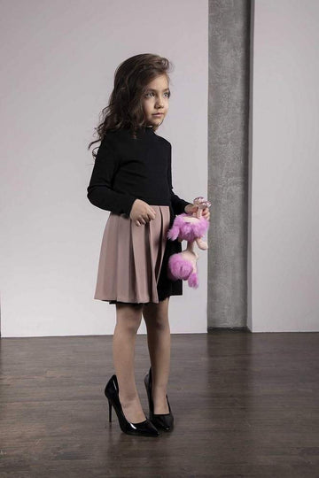 A 3/4 length pleated wrap skirt, made of soft black blush-colored crepe material, with the...