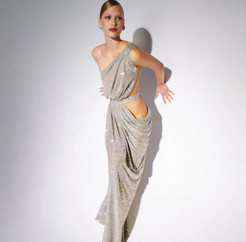 One shoulder cut out long sequin dress with pleated detailing colour may very due to lighting image ...