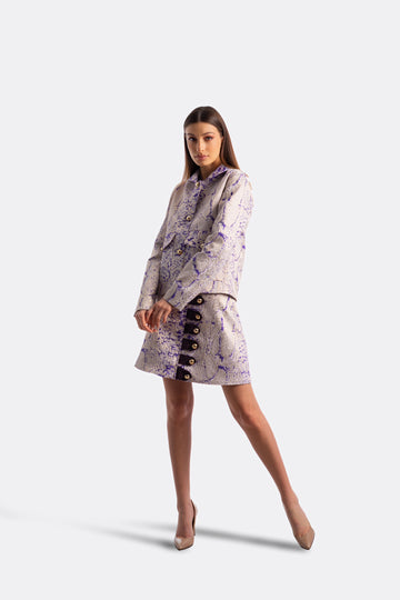 Product Description: Two piece blazer and skirt set Mini skirt with back zip closure Blazer with open front embellished...
