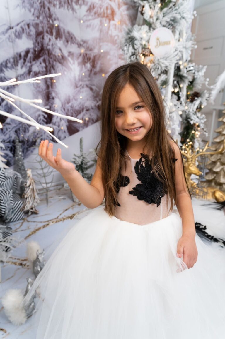 - White tulle dress with embroidered black appliqué.